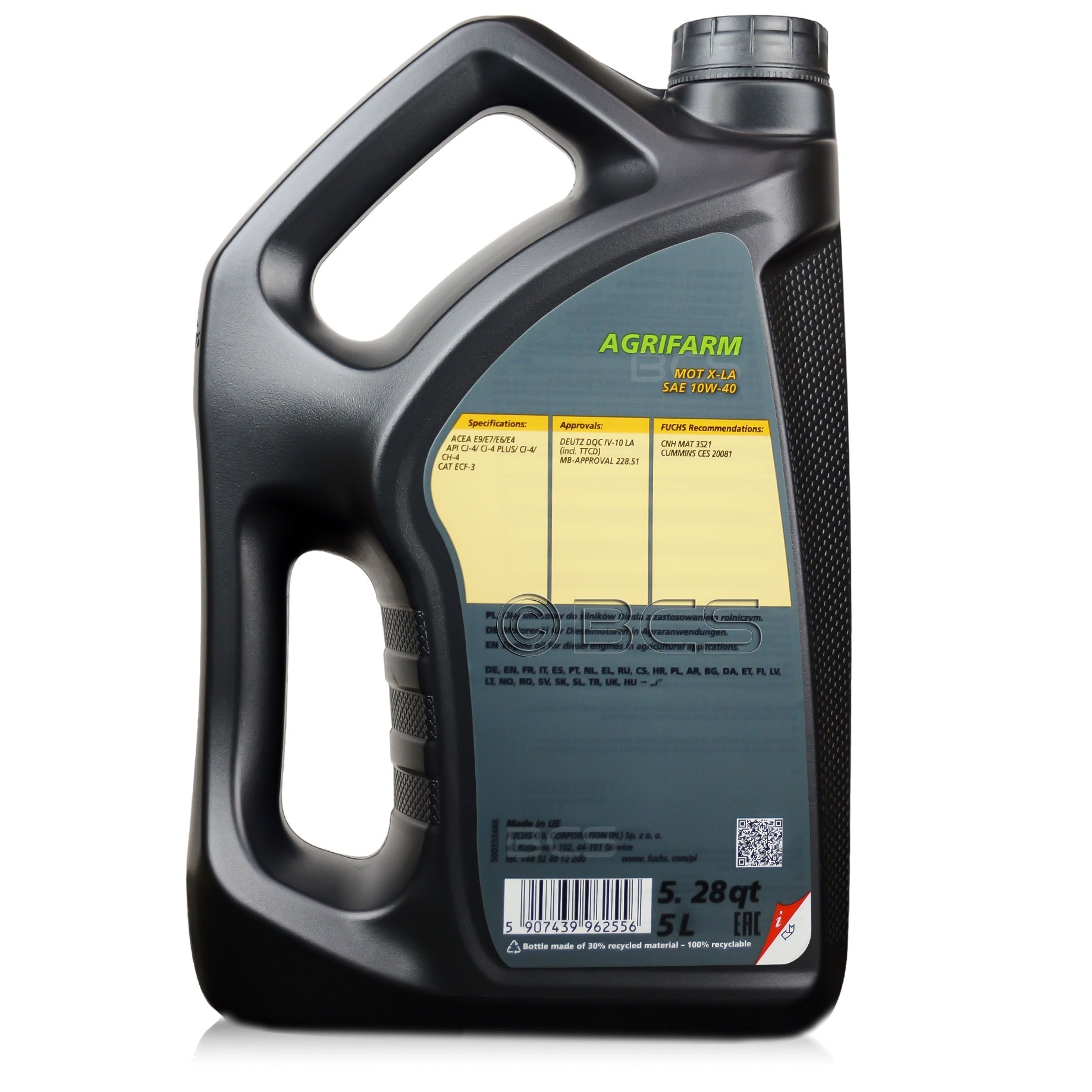 FUCHS AGRIFARM MOT X-LA 10W40 to najwyższej jakości olej silnikowy Low-SAPS, w klasie lepkości SAE 10W40, opracowany z myślą o silnikach wysokoprężnych z systemami oczyszczania spalin. Produkt dedykowany do maszyn i pojazdów rolniczych.