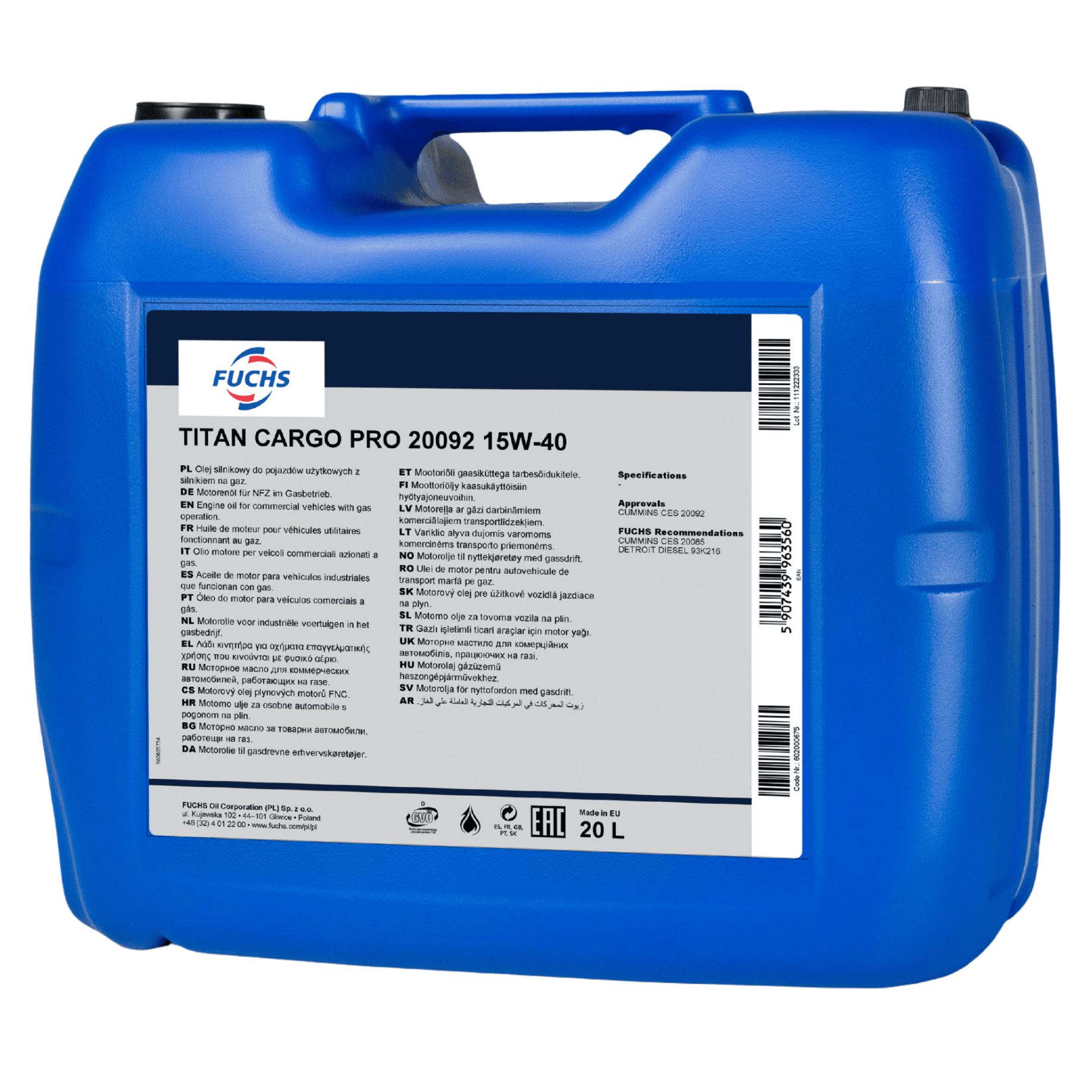 FUCHS TITAN CARGO PRO 20092 15W40 to najwyższej jakości olej silnikowy, dedykowany do mocno obciążonych silników, zasilanych gazem w pojazdach użytkowych.