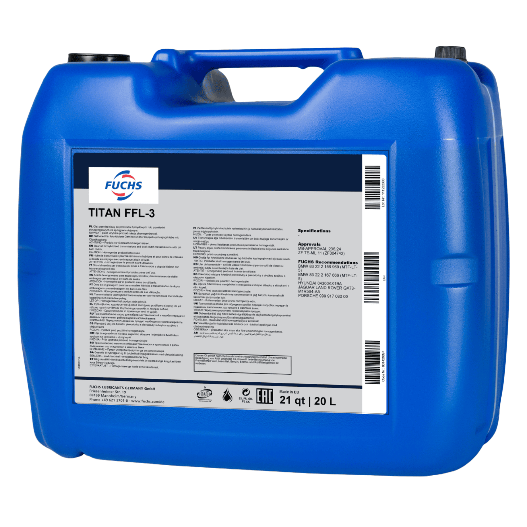 FUCHS TITAN FFL-3 to najwyższej jakości olej przekładniowy do skrzyń dwusprzęgłowych ZF z mokrym sprzęgłem, stosowanych m.in. w PORSCHE, BMW, MERCEDES BENZ oraz do manualnych skrzyń biegów wymagających normy BMW MTF LT-5. Stosowany jest również w przekładniach osi samochodów hybrydowych Mercedes.