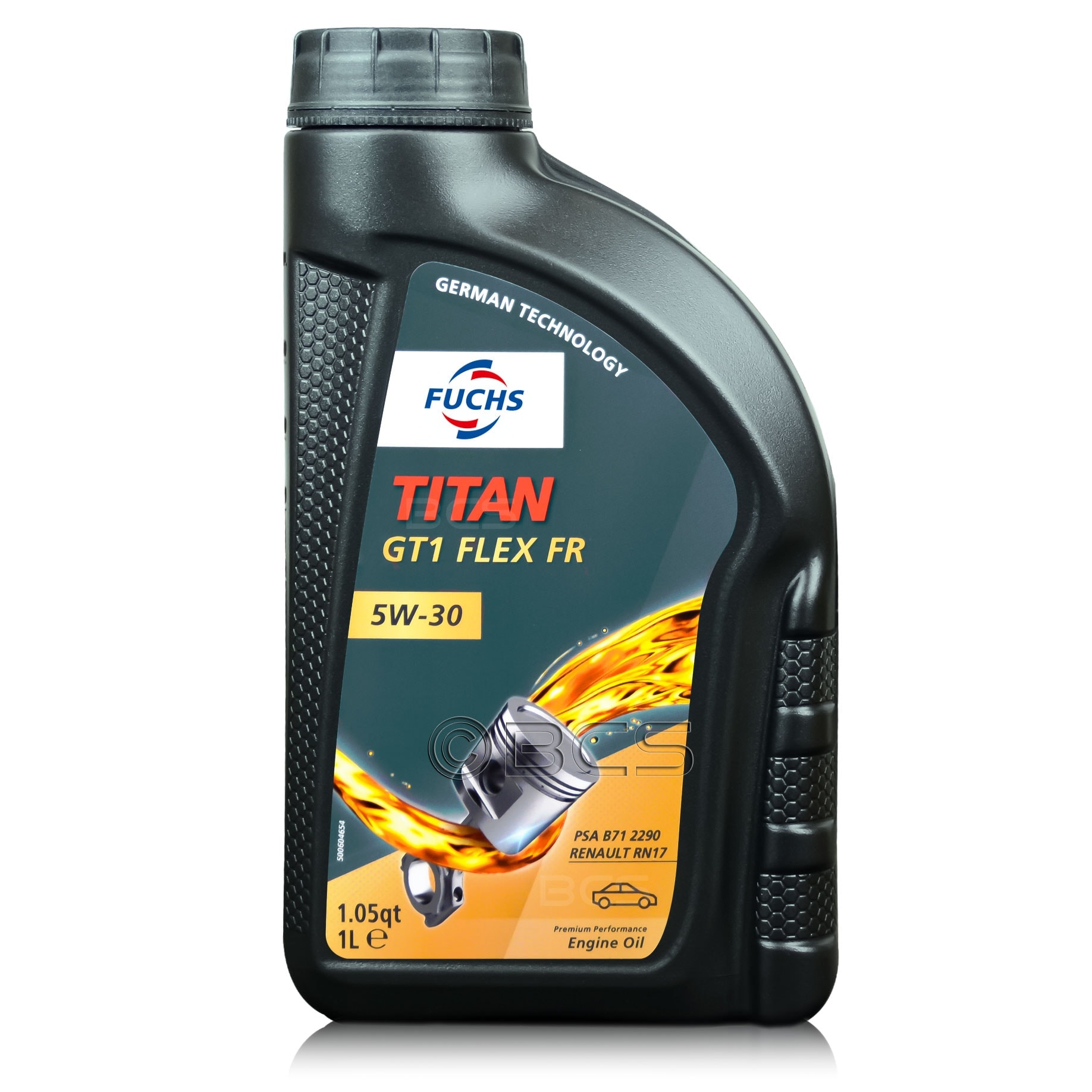 FUCHS TITAN GT1 FLEX FR 5W30 to najwyższej jakości, paliwooszczędny olej silnikowy, dedykowany do samochodów osobowych z silnikami benzynowymi i Diesla, w których przewidziano wydłużony okres między wymianami (LongLife). Olej FUCHS GT1 FLEX FR 5W30 został opracowany szczególnie dla samochodów marek PSA - PEUGEOT, CITROEN wymagających specyfikacji PSA B71 2290 oraz marki RENAULT dla specyfikacji RN17, wyposażonych w nowoczesne systemy oczyszczania spalin (katalizatory, filtry cząstek stałych, CRT) i turbosprężarkę.