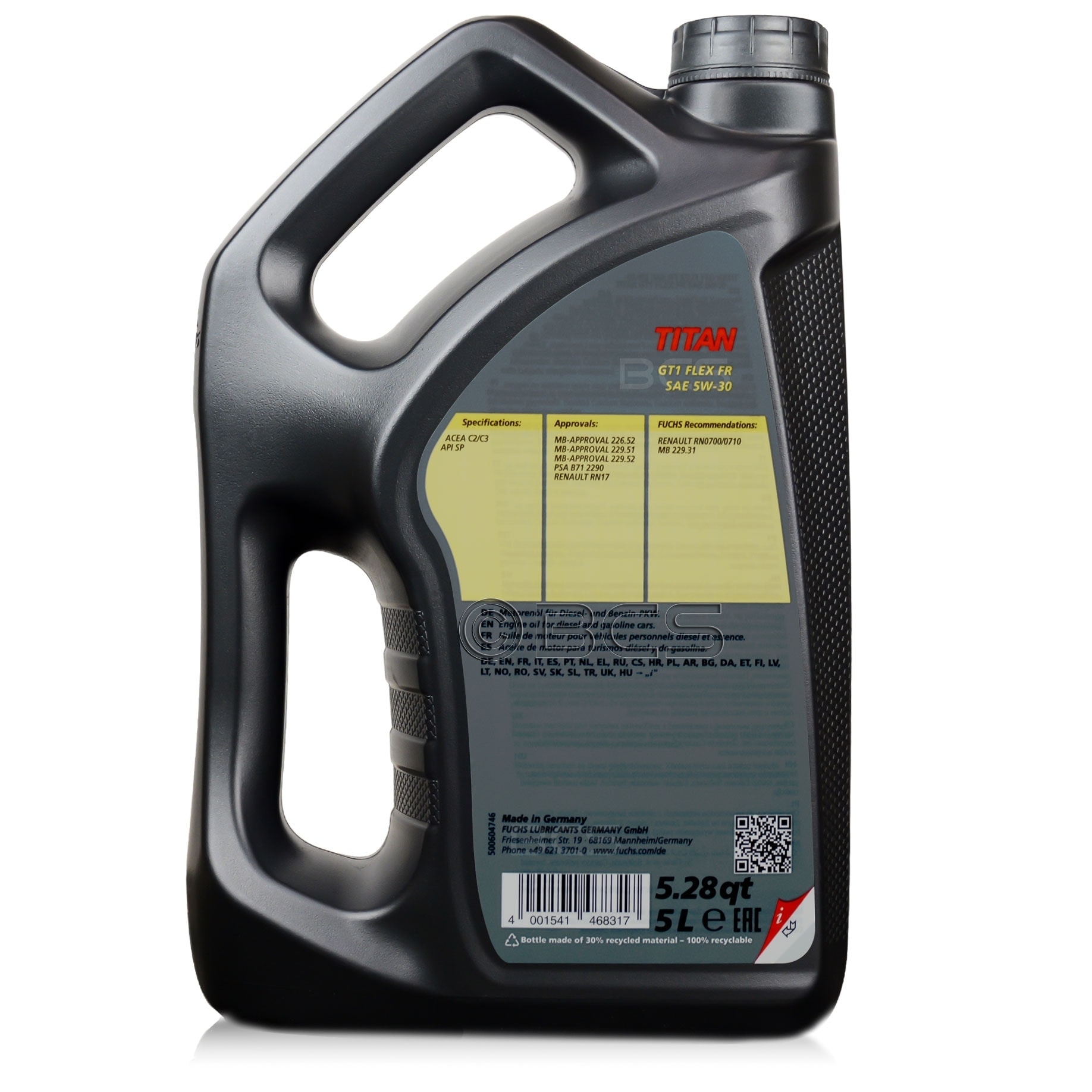 FUCHS TITAN GT1 FLEX FR 5W30 to najwyższej jakości, paliwooszczędny olej silnikowy, dedykowany do samochodów osobowych z silnikami benzynowymi i Diesla, w których przewidziano wydłużony okres między wymianami (LongLife). Olej FUCHS GT1 FLEX FR 5W30 został opracowany szczególnie dla samochodów marek PSA - PEUGEOT, CITROEN wymagających specyfikacji PSA B71 2290 oraz marki RENAULT dla specyfikacji RN17, wyposażonych w nowoczesne systemy oczyszczania spalin (katalizatory, filtry cząstek stałych, CRT) i turbosprężarkę.
