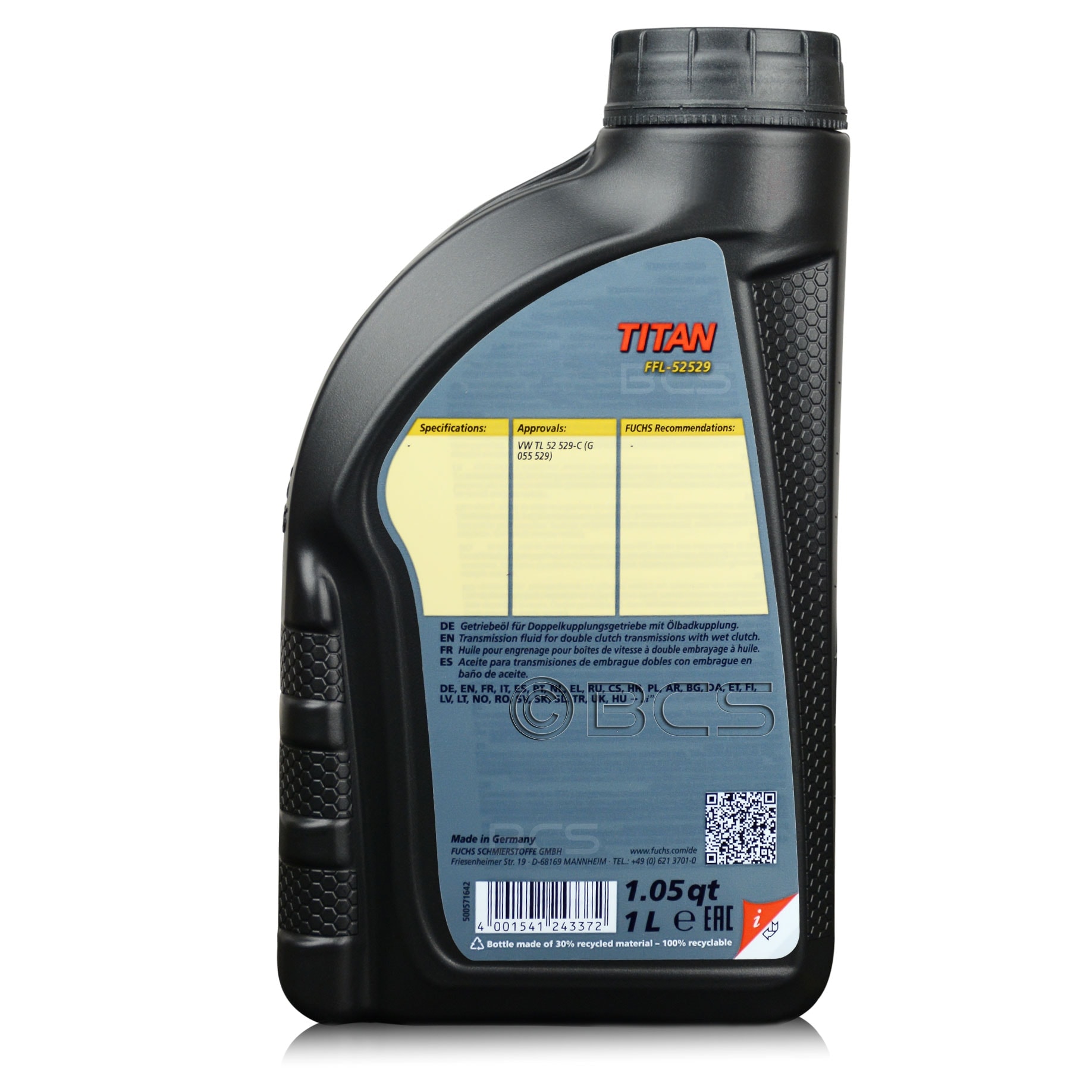 FUCHS TITAN FFL-52529 to najwyższej jakości olej przekładniowy w technologii XTL, do zastosowania w części sprzęgłowej dwusprzęgłowych skrzyń biegów DL382 i DQ381 grupy VW o symbolu 0CJ/0CK/0CL/0DN. Jest dokładnym odpowiednikiem oleju serwisowego VW G055529, spełniającym normę VW TL 52 529-C.