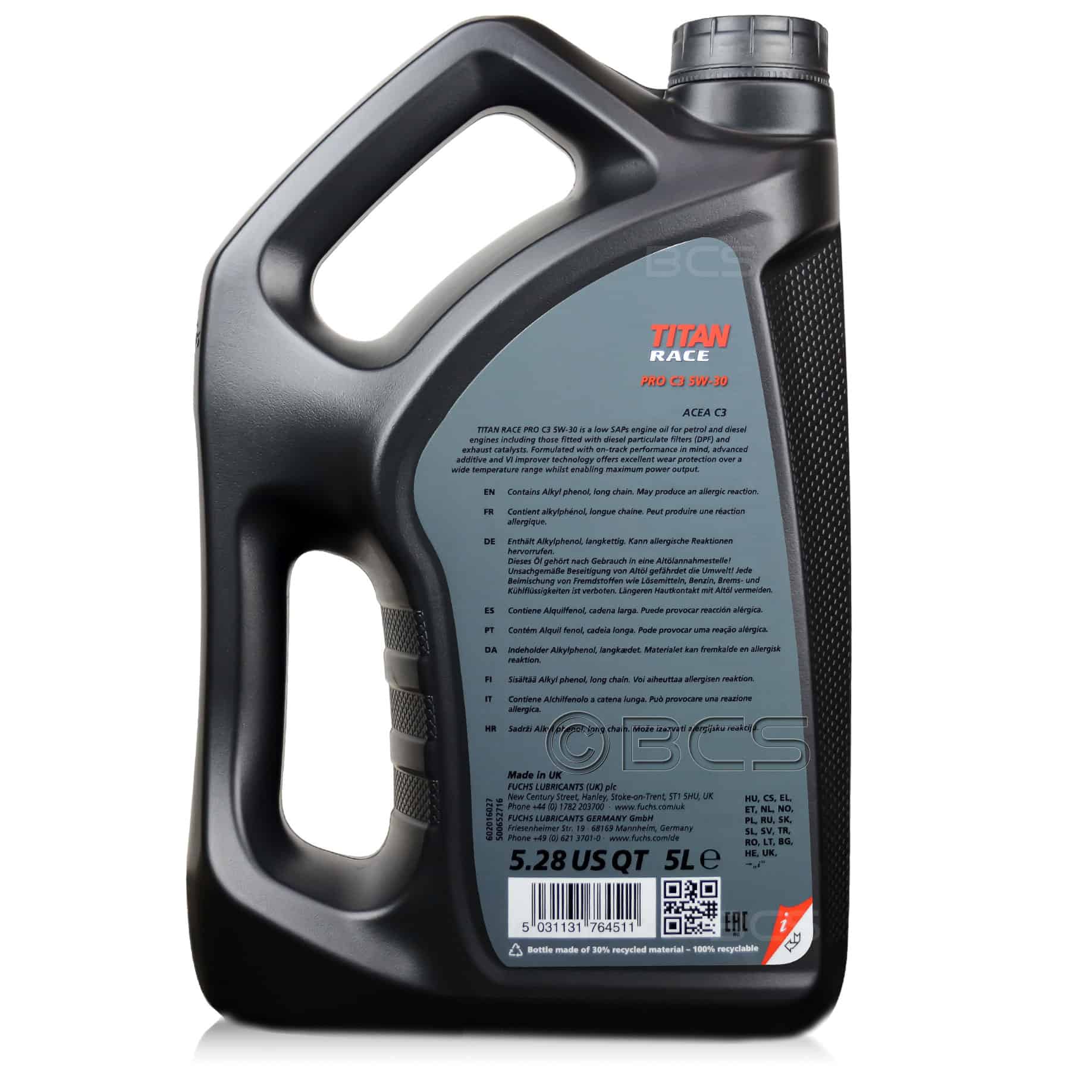 FUCHS TITAN RACE PRO C3 5W30 to najwyższej jakości, niskopopiołowy (low SAPS), syntetyczny olej silnikowy o lepkości SAE 5W30, dedykowany do najbardziej obciążonych silników samochodowych, szczególnie wykorzystywanych w zawodach sportowych i wyścigach.