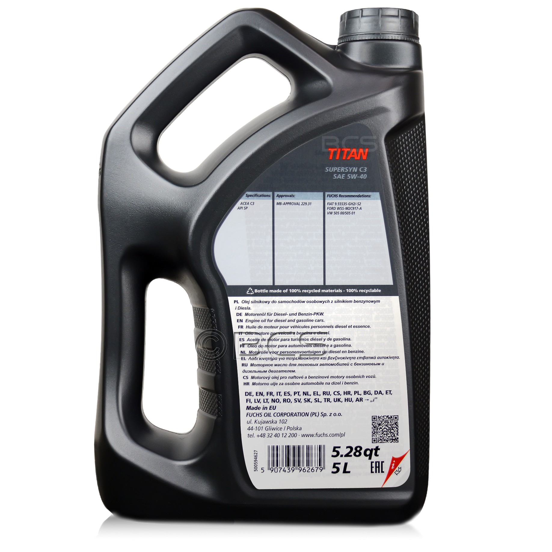 FUCHS TITAN SUPERSYN C3 5W40 to najwyższej jakości paliwooszczędny olej silnikowy, dedykowany do samochodów osobowych i dostawczych z silnikami benzynowymi i Diesla, w których przewidziano także wydłużony okres między wymianami (LongLife). FUCHS SUPERSYN C3 5W40 został opracowany szczególnie dla samochodów wyposażonych w nowoczesne systemy oczyszczania spalin i turbodoładowanie. Zapewnia: