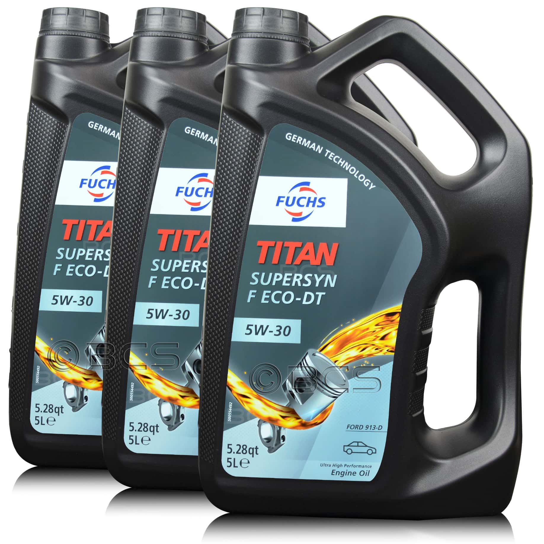 FUCHS SUPERSYN F ECO-DT 5W30 to najwyższej jakości, paliwooszczędny, wielosezonowy olej silnikowy, dedykowany do samochodów marki FORD, które napędzane są w szczególności silnikami DuraTorq oraz w innych jednostkach tej marki. Olej spełnia specyfikacje FORD WSS-M2C913-C oraz FORD WSS-M2C913-D. Może być stosowany zarówno w silnikach benzynowych, jak i Diesla, zapewniając optymalny rozruch w niskich temperaturach, a także niską emisję spalin.